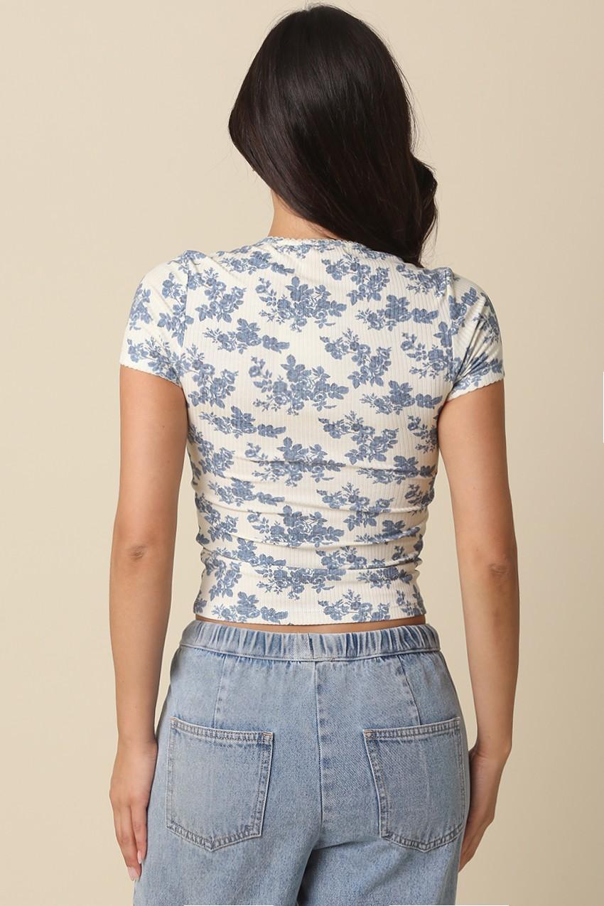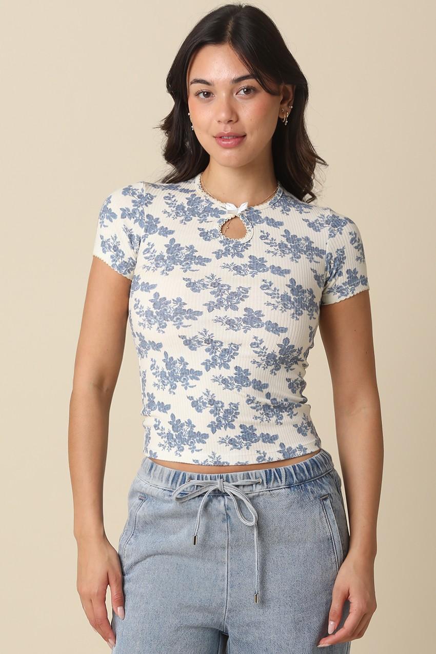 Our Norah Floral Keyhole Knit Top features a soft ribbed knit fabric with blue floral print and a front keyhole cutout with a small bow detail and a laced hemline. Knit