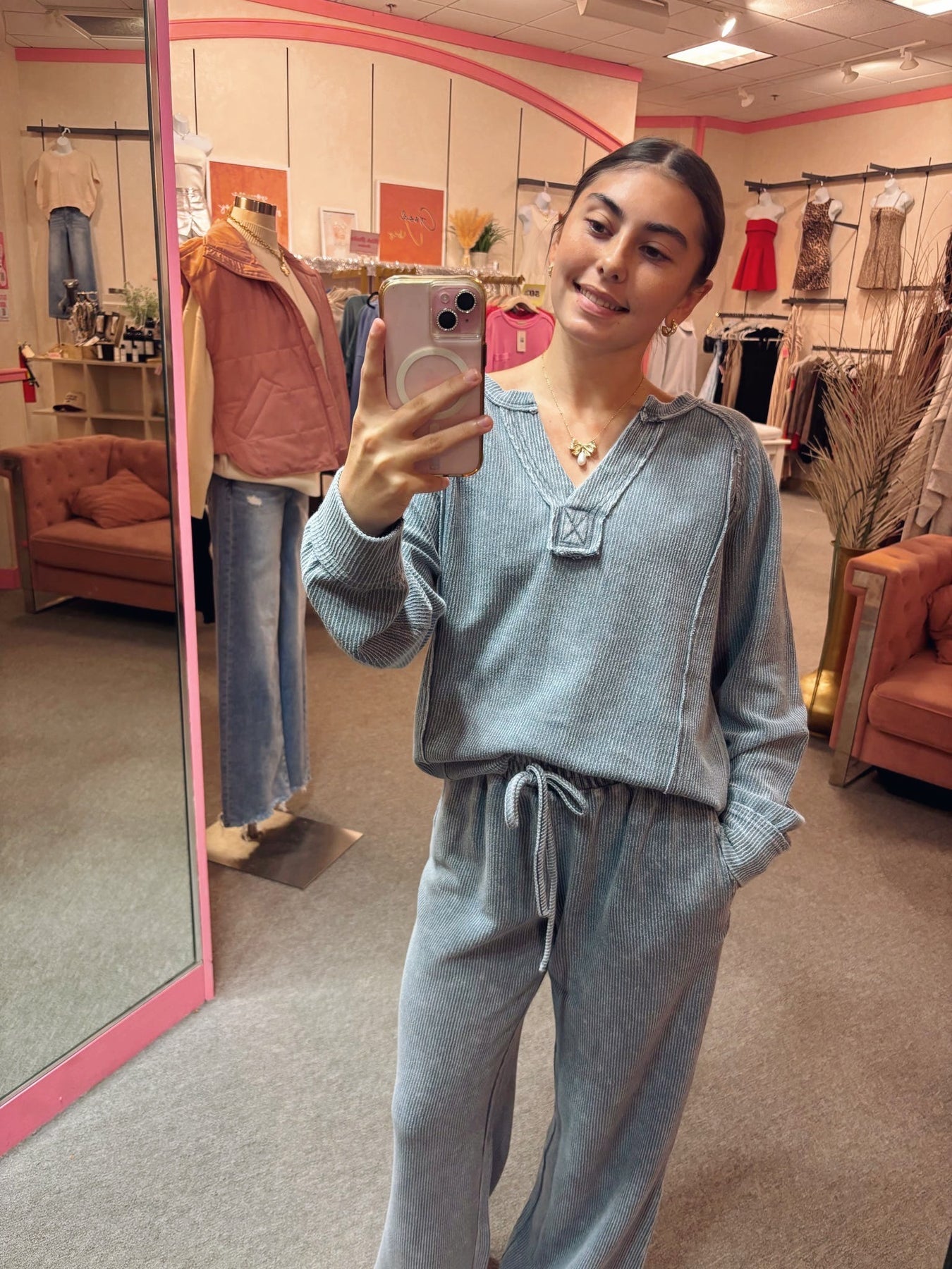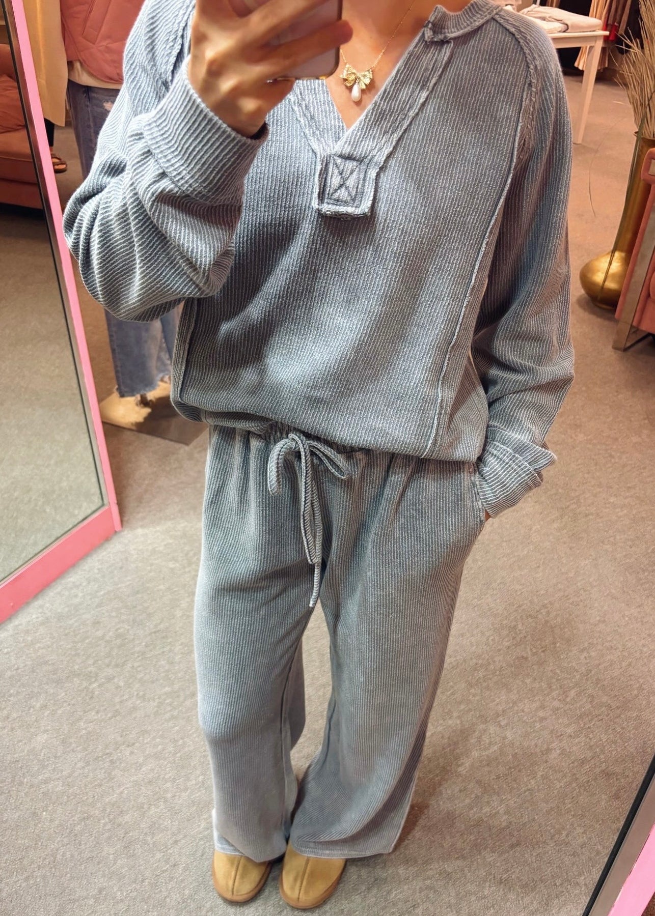 Say You Love Me Washed Split Neck Top - Charcoal & Navy