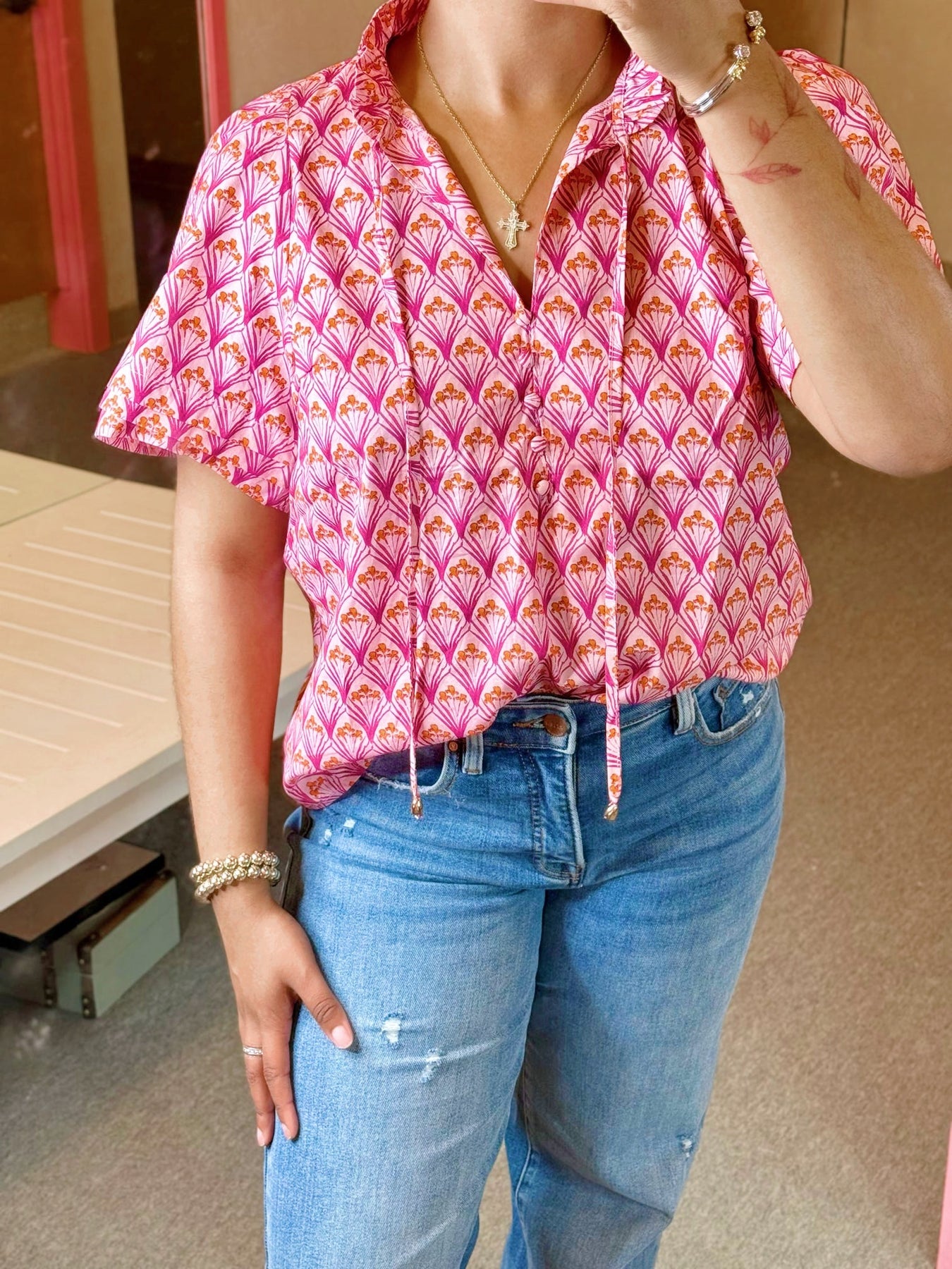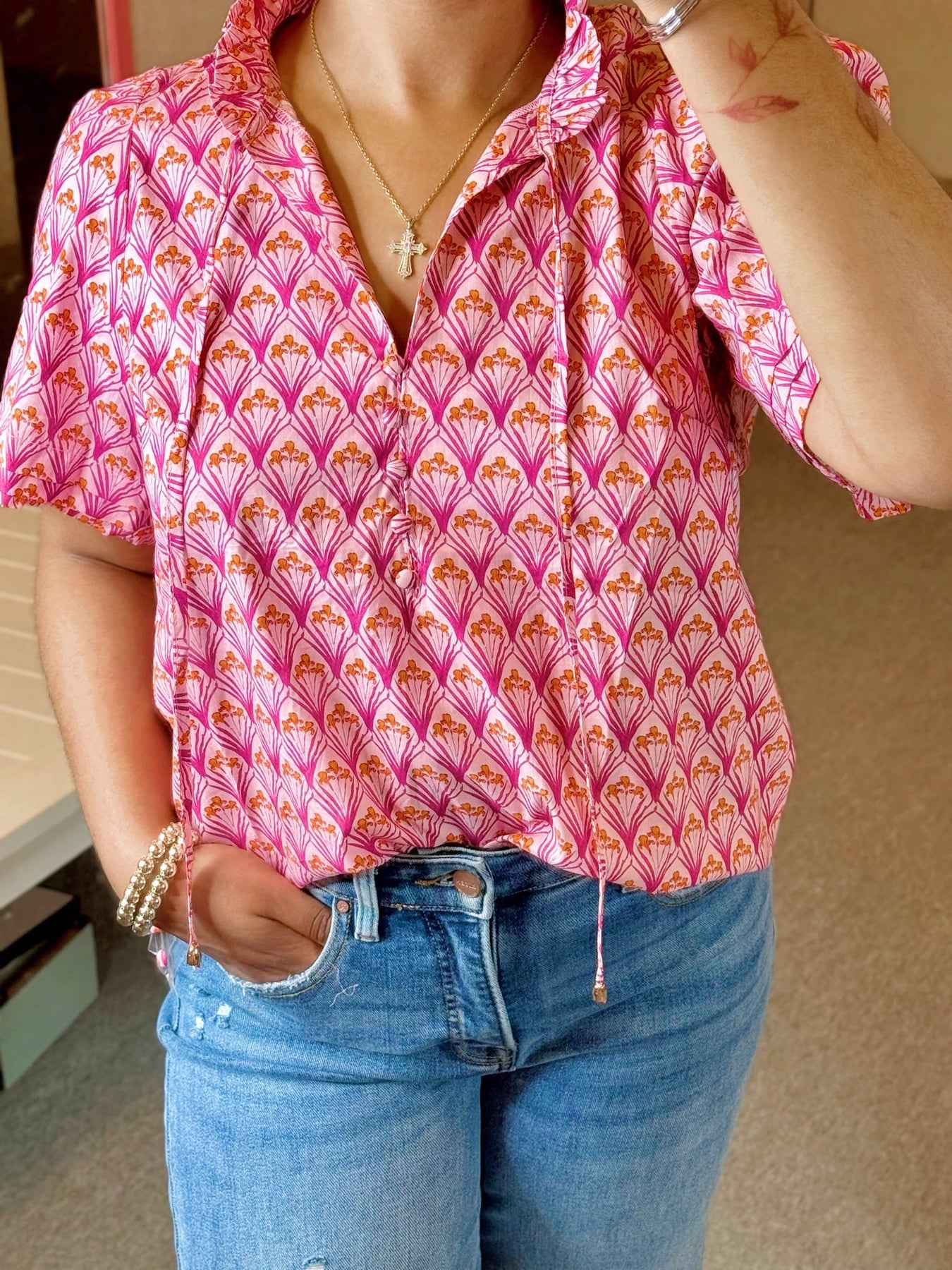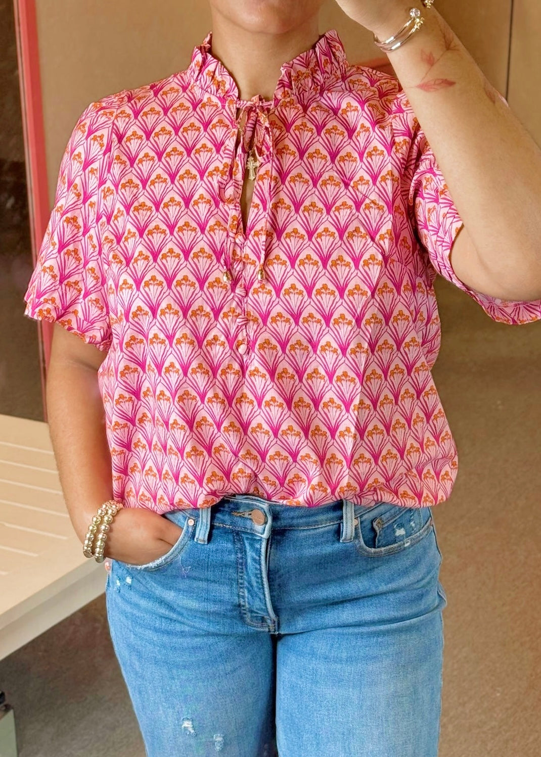 Short sleeve top with ruffle collar and tie front