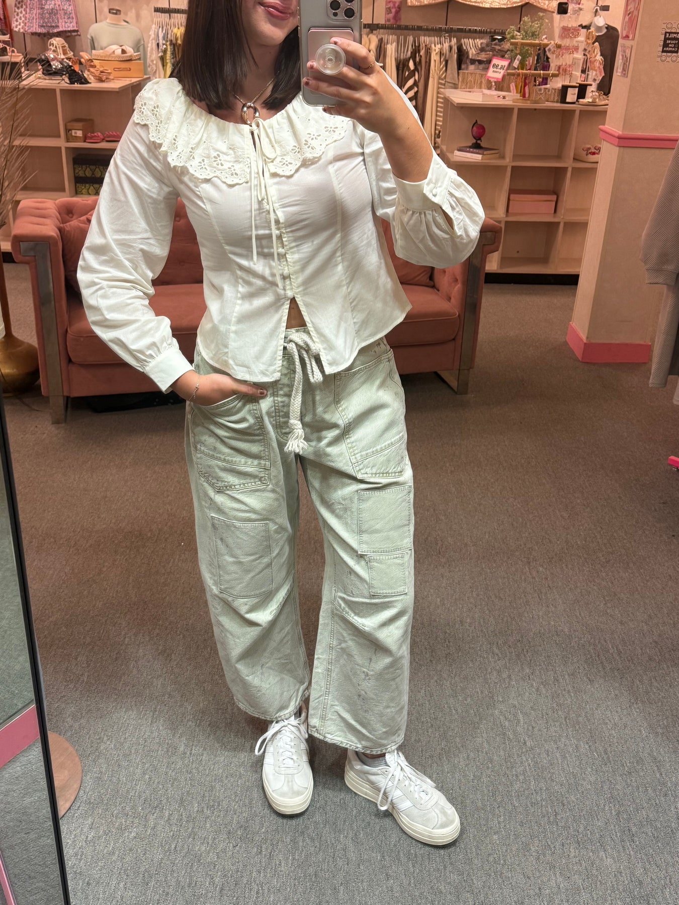 Cream long sleeve button up blouse with eyelet ruffle neckline